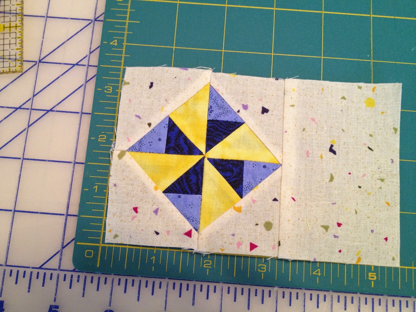 I paper pieced the Windmill block too, and it wasn't nearly as complicated as the Union Square block. The only thing I did wrong though, was that I forgot to reverse the pattern when I made the freezer paper foundations, so my windmill is blowing counter clockwise. I decided I could live with that and did not make these blocks over.