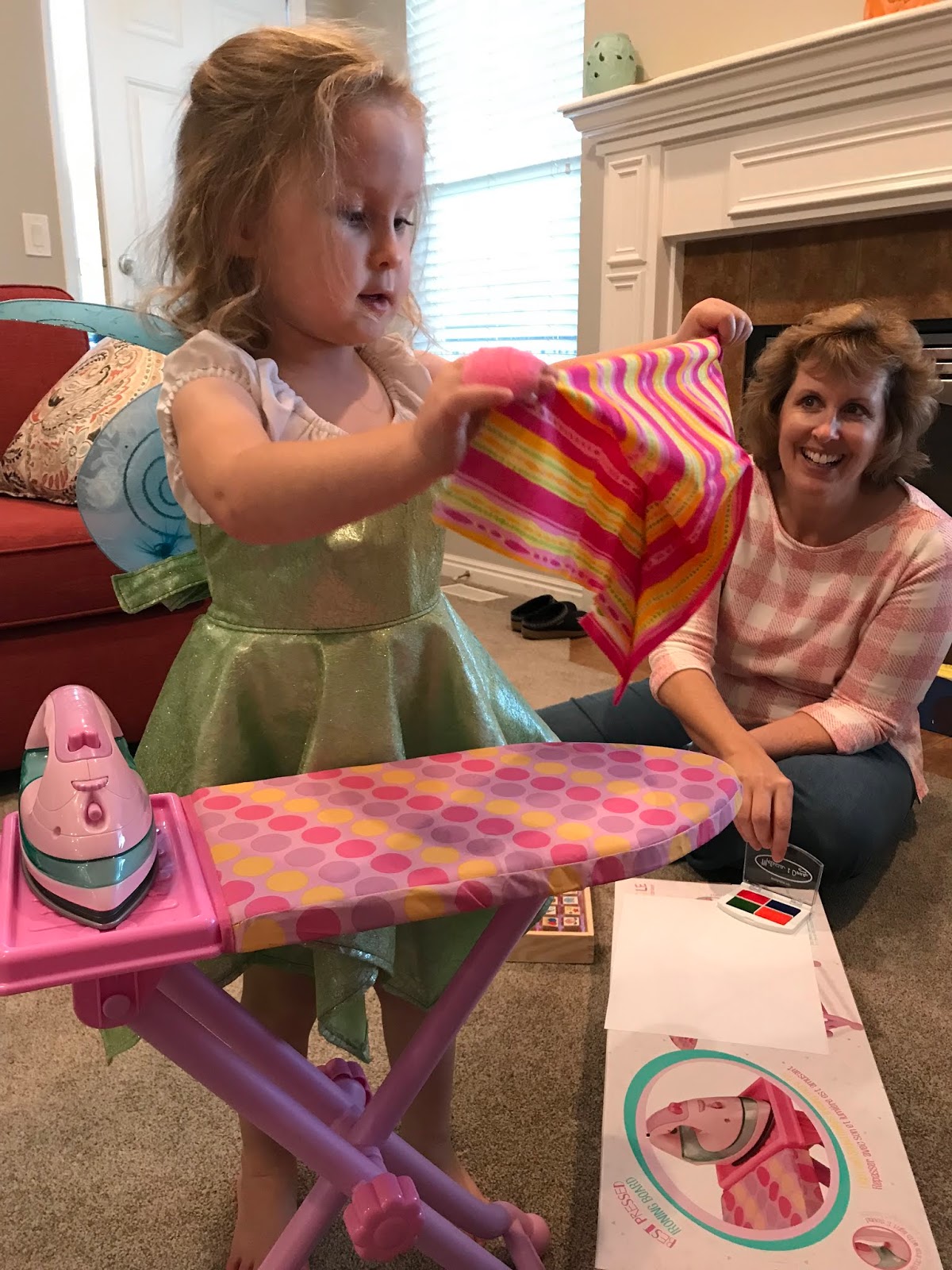 We are back from a fun weekend! Our granddaughter's birthday party was a blast. We got her this little ironing board and she was so excited to be "ironing fabric". A little quilter in the making :). She also got a "buyer" from her parents, which is what she really, really wanted and was so excited to get (SO CUTE). Now she can scan our purchases and swipe our credit cards and give us change. She is really getting the shopping thing down!